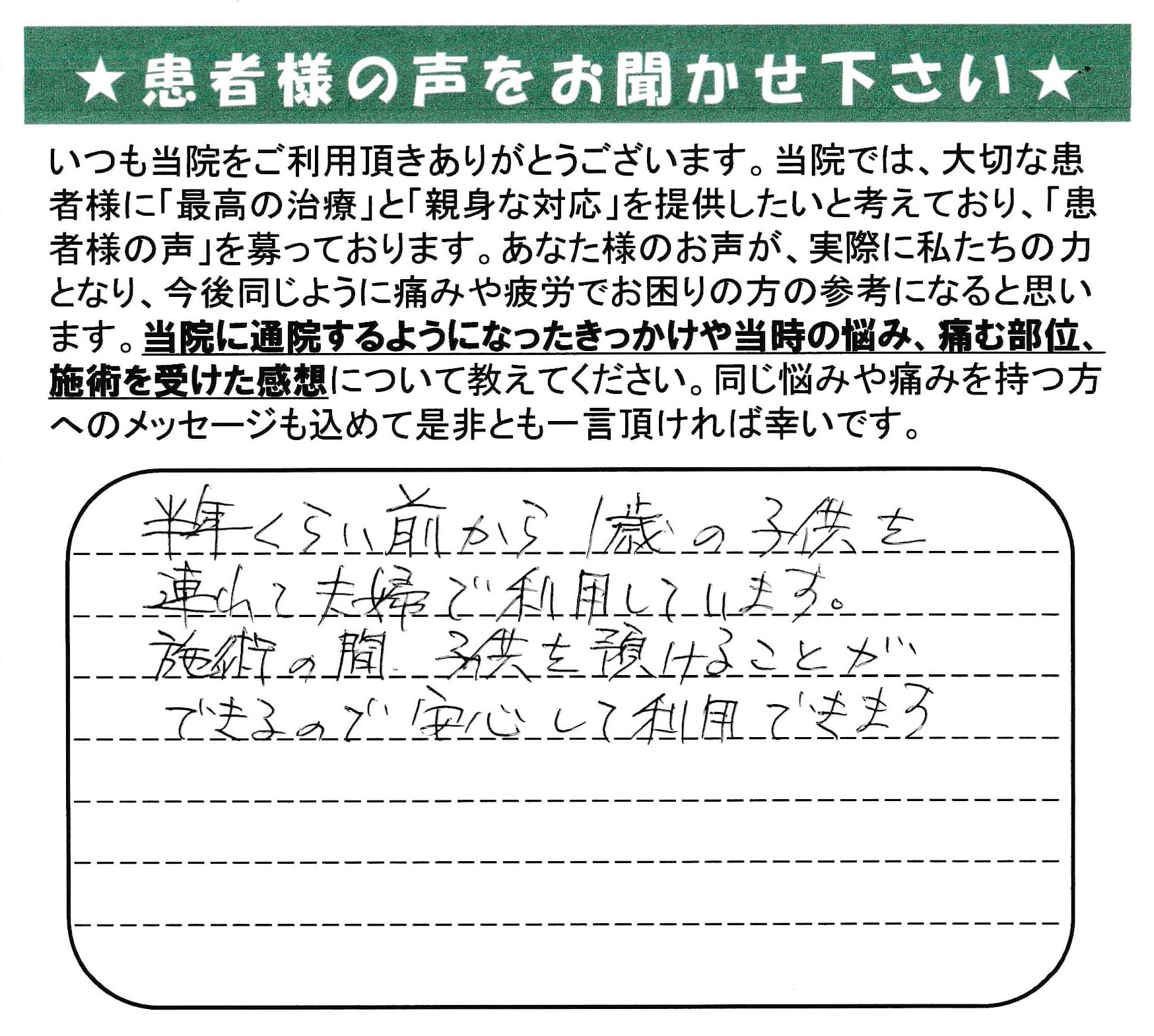 産後3ヶ月をすぎても腰が痛くて辛かったです。時間がかいけつしてくれると思っていましたが全く治らず、YouTubeなどで自己治療も試しましたが治らず…。そんな時にこちらのHPを見つけました。先生やスタッフの方がやさしく痛みによりそっていただけたおかげで産後6ヶ月ぐらいには産前に近いスタイルを取り戻すことができました。また、産後人と話す機会がなくさびしく心細かったですが、ここにきていろいろと子供のことや私生活についてなど話せてとてもリフレッシュできました