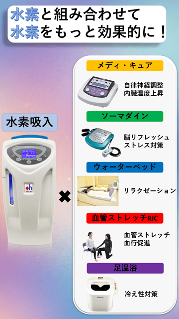 当院では水素吸入と合わせて微弱電流、ソーマダイン、メディキュア、ウォーターベッドマッサージ、足温浴、血管ストレッチの中からヒアリングをもとにあなたの症状、ご希望に合わせたプランをご提案させて頂きます。
